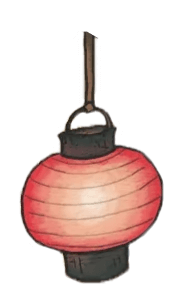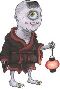 When a paper lantern reaches old age, it can become a tö: tin-obake. The paper spreads along one of its bamboo ribs to form a gaping, squinting mouth, from which a tongue protrudes. One or two eyes may appear in the upper half of the lantern.